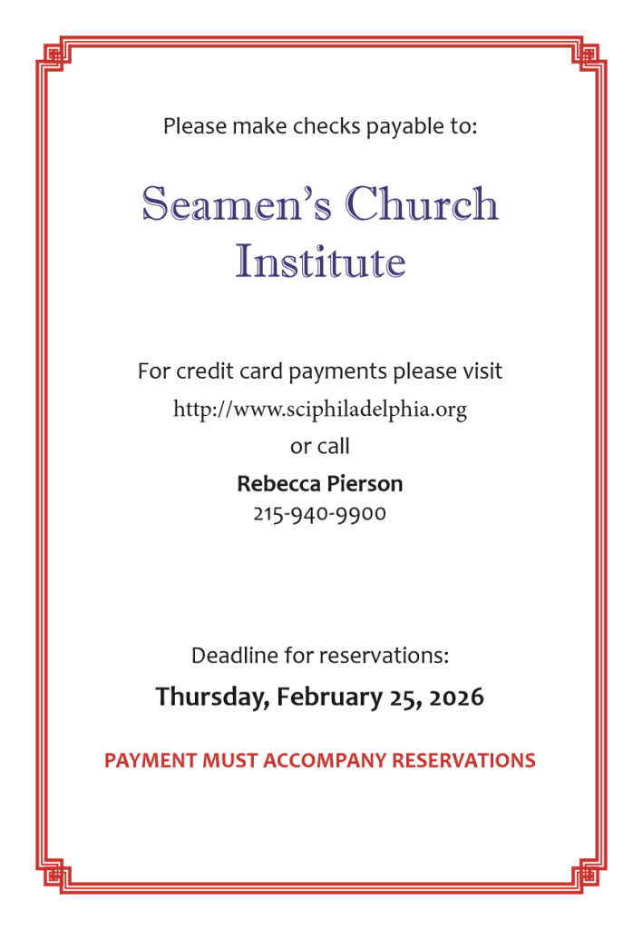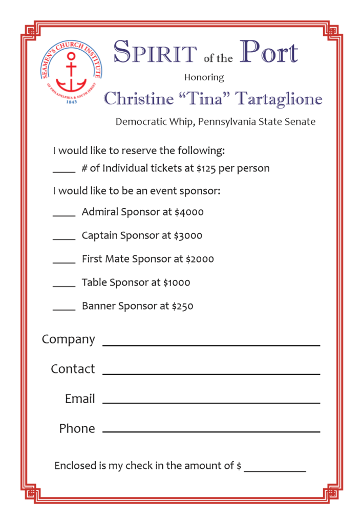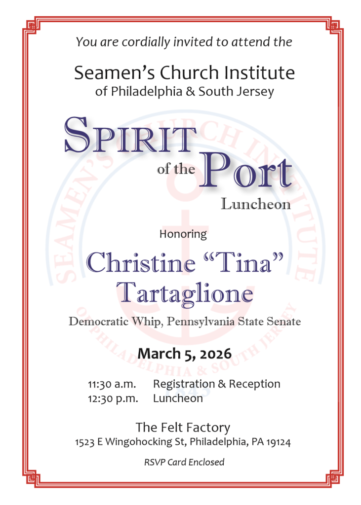 | Seamen’s Church Institute’s annual Spirit of the Port Award honors an individual who embodies the spirit and humanity of our regional port community. It is a distinct pleasure to announce that Pennsylvania State Senator Christine “Tina” Tartaglione will be our 2026 honoree, in recognition of her dedicated leadership to our region’s ports. We will celebrate Senator Tartaglione at a luncheon on Thursday, March 5, 2026 11:30 am to 2:00 pm The Felt Factory 1523 East Wingohocking Street Philadelphia, PA 19124 |
